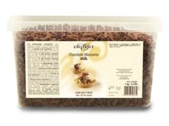 - 1kg of chocolate curls at wholesale cost, packed within a resealable plastic tub.