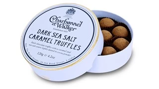 Luxury dark chocolate truffles with a soft caramel and sea salt centre, dusted in cocoa powder.