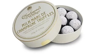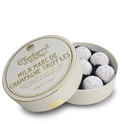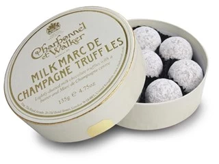 Marc de Champagne truffles. Milk chocolate, filled with a sensational rich chocolate ganache of butter and Marc de Champagne. A very British type of chocolate truffle from Charbonnel et Walker.