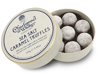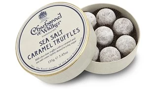 Luxury milk chocolate truffles with a soft caramel and sea salt centre, dusted in icing sugar.