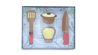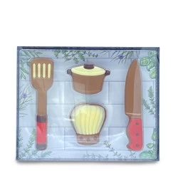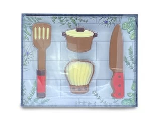 A fun chocolate gift for the budding chef in your life. These chocolate cooks kitchen tools are made from fine milk chocolate with coloured decoration and white & dark chocolate detailing.