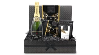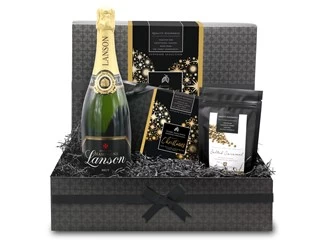 With its stylish, Xmas themed presentation and high quality contents of Lanson Black Label NV Champagne, luxury chocolate selection box and salted caramel chocolate drops for nibbling.
