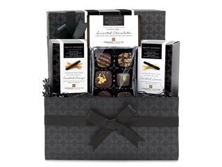 A delicious mini hamper, from our Superior Range especially for dark chocolate lovers. Contains 6 “Superior Selection” assorted dark chocolates from our gourmet chocolate range and dark chocolate enrobed candied lemons & candied oranges, gift cubes.