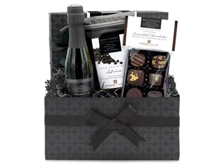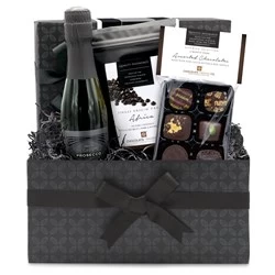A delicious mini hamper from our Superior Range especially for dark chocolate lovers. Contains 20cl bottle of Il Caggio, extra dry Prosecco, 6 “Superior Selection” assorted dark chocolates from our gourmet chocolate range and a ‘Africa’ single-origin, dark chocolate drops, nibble pouch.