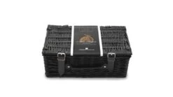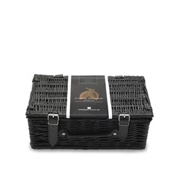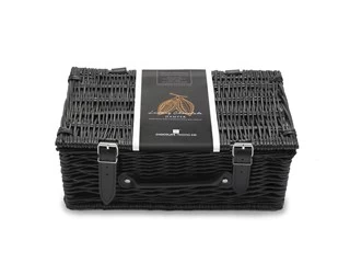 A small, black wicker, empty gift hamper for you to add to your basket along with any chocolates you choose to include (this small sized hamper is not suitable for wine or Champagne bottles. A large wicker hamper box is available). Your basket contents will be packed within the hamper and gift finished.