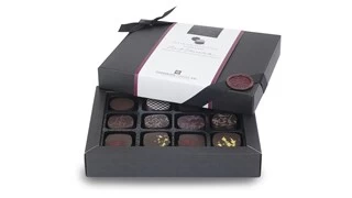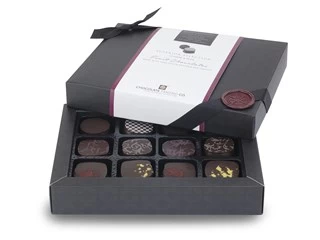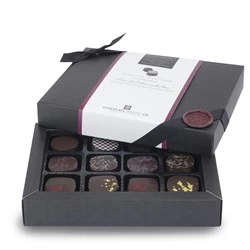 An exquisite selection of 6 different dark chocolates chosen for their purity of ingredients and outstanding flavours. Each containing different fruits which complement the dark chocolate beautifully. Presented in a sophisticated gift box complete with gros grain ribbon and embossed wax seal.