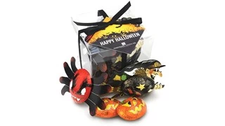 A funky gift cube containing a fun mix of halloween chocolates including a witch, ghost, spider and pumpkin.