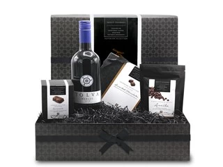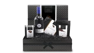A luxury milk chocolate gift hamper. Carefully chosen Merlot, paired with our Superior Selection milk chocolate selection box, enrobed salted caramels & single origin milk chocolate drops.