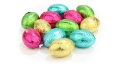 Mini Easter eggs made from solid milk chocolate. Foiled in pink, gold, blue and green. These mini eggs are the best choice for bulk, cheap mini eggs where the lowest cost is a key requirement.