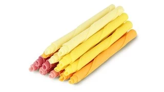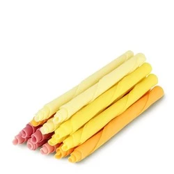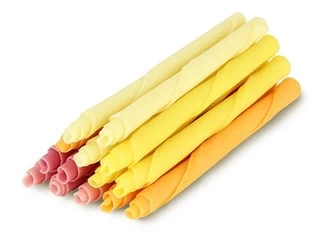 Chocolate cigarellos for cakes and desserts. These fun, multi-coloured chocolate cigarellos are perfect for celebration cakes with their bright colours and twisted detail design. Made from high quality, Belgian white chocolate. Contains dark pink, light pink, orange, yellow and ivory. Teamed with brightly coloured candles nothing says happy birthday more than these colourful yet extremely simple cake decorations.