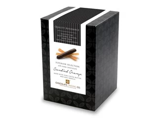 Generous strips of flavour packed candied orange enrobed in a fine dark chocolate.
