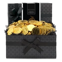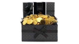 Un-tie the ribbon and open the hamper lid to reveal a shimmering treasure of 100, gold foiled chocolate coins, in a Gold Sovereign design.