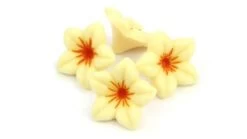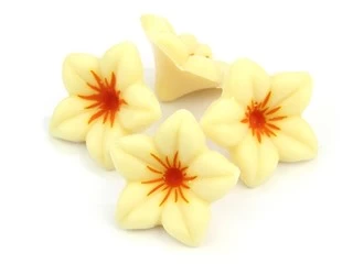 White chocolate flowers in the form of lillies for decorating cupcakes, celebration cakes and desserts.