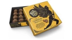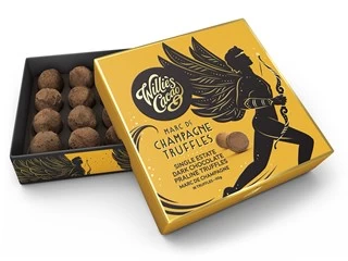 Deep, dark and decadent chocolate truffles. Soft, nutty, single estate dark chocolate infused with smooth Marc de Champagne and freshly roasted hazelnuts. Totally natural. Simply sublime